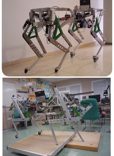 Robot with twelve motors, three per leg, featuring two wheels on its rear legs that simplify gait dynamics and allow it to overcome obstacles. On flat terrain, it reaches a speed of 1 m/s.